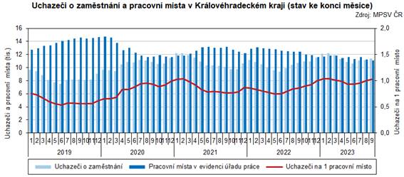 Nabídka volných pracovních míst v Královéhradeckém kraji představovala 11 091 míst. Ve srovnání s předchozím měsícem klesl počet pracovních míst v evidenci úřadu práce o 156 míst, tj. o 1,4 %, oproti září 2022 to bylo o 1 337 míst méně, tj. o 11,8 %. Z celkového úhrnu bylo 18,0 % míst určeno pro absolventy a mladistvé a 4,2 % míst pro osoby se zdravotním postižením.