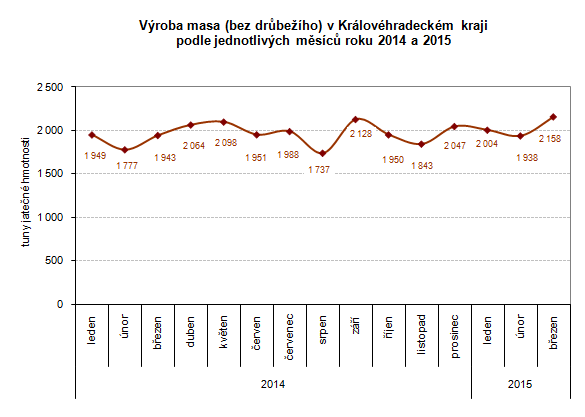 Celkem bylo v kraji v průběhu prvních třech měsíců vyrobeno 6,1 tis. tun masa v jatečné hmotnosti (bez masa drůbežího), tj. o 7,6 % více proti loňské srovnatelné skutečnosti. Převažující část výroby v kraji tvořilo vepřové maso (76,8 %), kterého se vyrobilo o 7,8 % více.