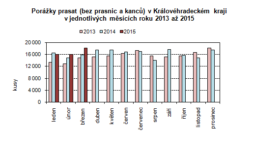 Počty poražených prasat (bez prasnic a kanců) se v Královéhradeckém kraji meziročně zvýšily o 6,0 %, tj. o 2 849 kusů. V České republice se naopak meziročně snížily o 1,8 %. Ze 14 krajů došlo ke zvýšení počtu poražených prasat u osmi krajů, ostatní kraje zaznamenaly pokles. Nejvyšší nárůst byl v krajích Ústeckém, Zlínském a Plzeňském, k největšímu meziročnímu propadu došlo v krajích Pardubickém a Moravskoslezském, kde bylo prasat poraženo o 29 % resp. o 22,1 % méně.