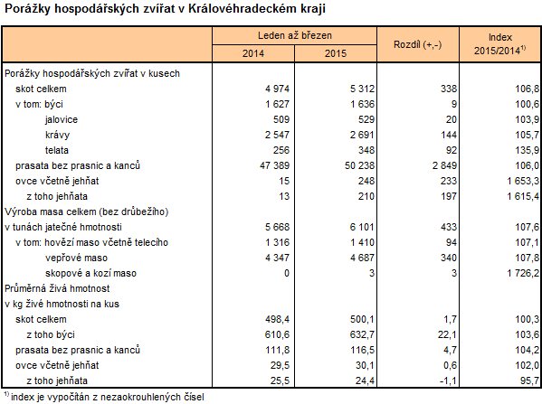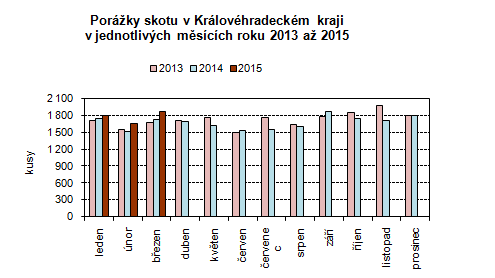 V období od ledna do března 2015 bylo v Královéhradeckém kraji poraženo celkem 5 312 kusů skotu, tzn. meziroční zvýšení o 6,8 % (tj. o 338 kusů). Nárůst zaznamenaly všechny kategorie skotu. Mezi poraženými kusy převažovaly z 50,7 % krávy a bylo jich poraženo o 5, 7 % více než loni. Telat pak bylo poraženo o třetinu více, býků o 0,6 % více a jalovic o 3,9 % více. Na celkovém počtu poraženého skotu v České republice (56,4 tis. kusů) se Královéhradecký kraj podílel 9,4 %, což byl čtvrtý nejvyšší podíl za kraji Vysočina (22,2 %), Pardubickým (21,5 %) a Plzeňským (11,4 %). Pokles poraženého skotu zaznamenaly kraje Jihočeský, Pardubický, Jihomoravský a Liberecký.