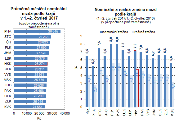 Za první dvě čtvrtletí roku 2017 vzrostla meziročně průměrná hrubá nominální mzda v Královéhradeckém kraji o 7,2 %, tj. o 1 760 Kč na 26 274 Kč. Tempo růstu mezd bylo rychlejší než průměr za ČR (6,5 %), mezi kraji páté nejrychlejší. Mzdy rostly nejrychleji v kraji Plzeňském a Karlovarském (shodně o 8 %) a naopak nejpomaleji v Hl. městě Praze a Moravskoslezském kraji (o 5,2 %, resp. 5,6 %).