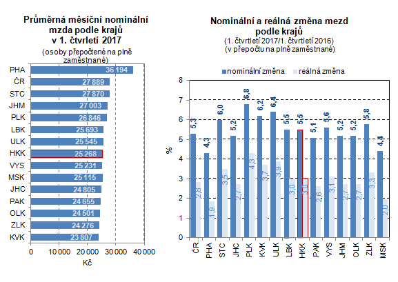 Za první tři měsíce roku 2017 dosáhla průměrná hrubá měsíční nominální mzda v Královéhradeckém kraji hodnoty 25 268 Kč (osoby přepočtené na plně zaměstnané) a proti stejnému období loňského roku vzrostla o 1 307 Kč, tj. o 5,5 %. Tempo růstu mezd v kraji mírně převýšilo celorepublikový průměr (5,3 %) a mezi kraji to byla prostřední (sedmá) příčka. Nejrychleji rostly mzdy v kraji Plzeňském (o 6,8 %) a naopak nejpomaleji v Hlavním městě Praze (o 4,3 %).