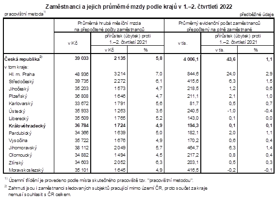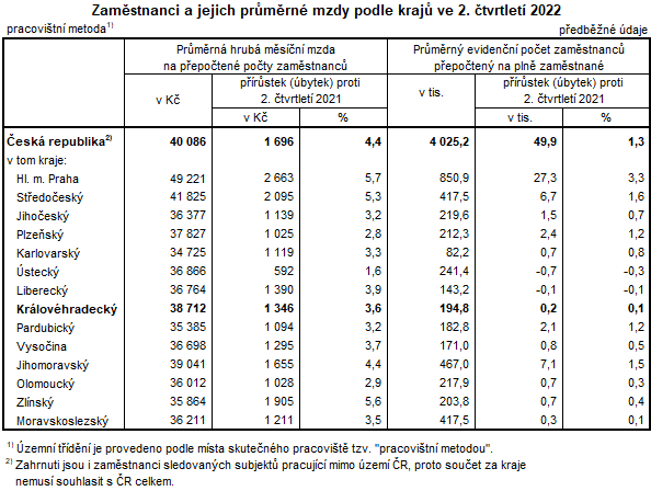 V 1. pololetí zaměstnávaly subjekty s pracovištěm v Královéhradeckém kraji celkem 194,3 tisíc osob (osoby přepočtené na plně zaměstnané). Ve srovnání se stejným obdobím roku 2021 došlo k nárůstu počtu zaměstnanců o 0,1 tisíce, tj. o 0,1 %. Meziroční růst počtu zaměstnanců zaznamenalo 12 krajů. Opačný trend vykázal kraj Ústecký (pokles o 0,4 %, tj. 1 tis. osob) a Moravskoslezský (pokles o 0,1 %, tj. 0,2 tis. osob). Naopak nejvyšší nárůst počtu zaměstnanců v absolutním i relativních vyjádření byl evidován v hl. městě Praze (o 2,9 %, tj. 24,0 tis. osob). V České republice se průměrný počet zaměstnanců meziročně zvýšil o 1,1 % na 4 006,1 tis. osob.