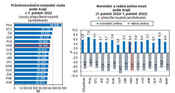 Výši reálných mezd ovlivňuje vedle úrovně nominálních mezd i vývoj inflace. Spotřebitelské ceny v ČR vzrostly v 1. pololetí o 13,5 %. Reálná mzda v Královéhradeckém kraji klesla o 7,6 %. V rámci ČR reálná mzda klesla o 6,8 %. Reálný pokles mzdové úrovně zaznamenalo všech 14 krajů České republiky, nejvyšší pokles byl v Karlovarském kraji (o 8,7 %).