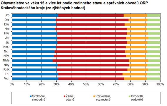Rodinný stav obyvatel kraje se lišil i v jednotlivých správních obvodech ORP Královéhradeckého kraje. Nejvyšší podíl svobodných mezi obyvateli ve věku 15 a více let měly správní obvody Broumov a Vrchlabí (shodně 31,3 %) a nejnižší správní obvod ORP Nové Město nad Metují (27,5 %). V tomto správním obvodě byl i nejvyšší podíl ženatých a vdaných (51,3 %) na rozdíl od správního obvodu Trutnov, kde byl podíl osob žijících v manželství 43,4 %, a to bylo nejméně v kraji. Správní obvod ORP Trutnov měl i největší podíl rozvedených (16,6 %), naopak nejméně jich bylo ve správním obvodě Nový Bydžov (12,2 %). Nejvyšší podíl ovdovělých měl správní obvod Nová Paka (9,4 %) a nejnižší správní obvod Jaroměř (8,0 %).