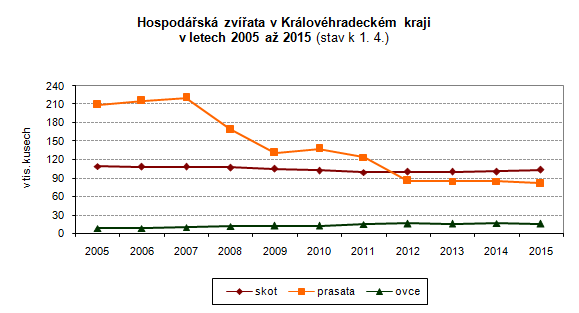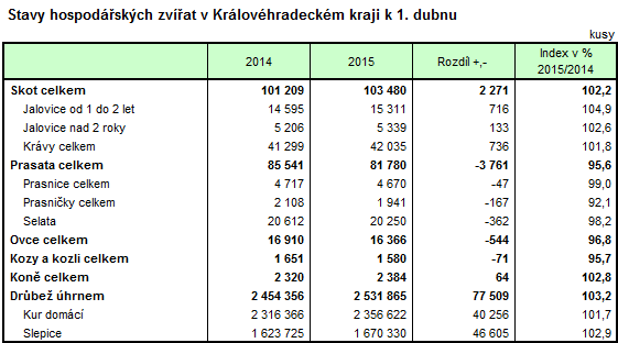 Podle soupisu hospodářských zvířat k 1. dubnu 2015 se v Královéhradeckém kraji ve srovnání s předchozím rokem změnily stavy hlavních druhů zvířat následovně: