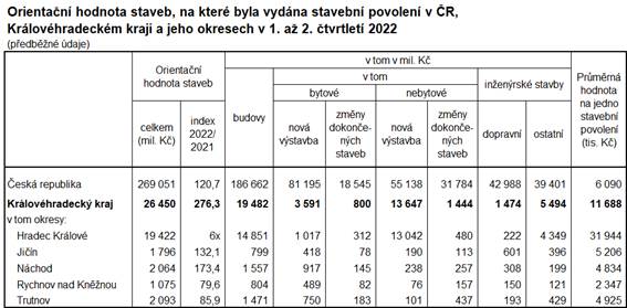 V České republice dosáhla orientační hodnota staveb v 1. pololetí 2022 celkové výše 269,1 mld. a meziročně vzrostla o pětinu. V jedenácti krajích došlo k meziročnímu růstu hodnoty staveb. Vedle Královéhradeckého kraje, kde bylo tempo růstu v 1. pololetí nejrychlejší, zaznamenal více než 50% nárůst Pardubický kraj, v Karlovarském a Plzeňském kraji byl nárůst hodnoty staveb 46,2 %, resp. 45,5 %. Ve třech krajích došlo k meziročnímu poklesu, nejvýraznější v Libereckém kraji (o 35,0 %).