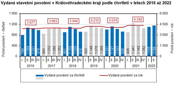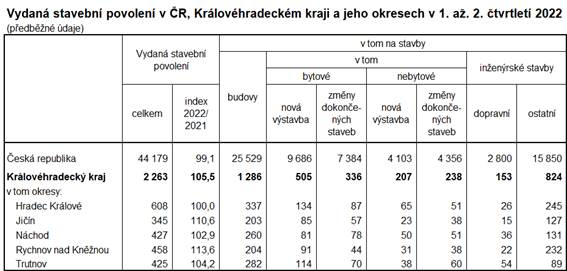 V Královéhradeckém kraji bylo během 1. až 2. čtvrtletí 2022 vydáno celkem 2 263 stavebních povolení (SP), tj. o 5,5 % více než ve stejném období loňského roku. Mezi kraji to bylo čtvrté nejrychlejší tempo růstu.