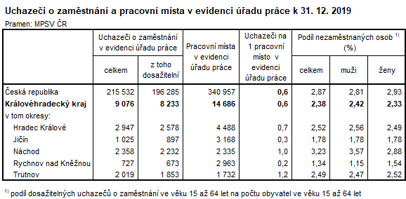 Podíl nezaměstnaných osob v Královéhradeckém kraji na konci roku zaznamenal nárůst o 0,27 procentního bodu, dosáhl hodnoty 2,38 %. Ve srovnání s průměrem celé ČR byl podíl nezaměstnaných osob v Královéhradeckém kraji o 0,5 procentního bodu nižší. Z genderového pohledu na krajské úrovni byla v prosinci nezaměstnanost žen nižší než nezaměstnanost mužů (muži 2,42 %, ženy 2,33 %). V republikovém průměru však byl podíl nezaměstnaných žen vyšší než u mužů, a to o 0,1 procentního bodu.