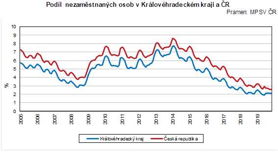Ve srovnání se stejným obdobím roku 2018 vzrostl v Královéhradeckém kraji počet uchazečů o zaměstnání o 1,2 %. Ve všech okresech došlo k růstu počtu uchazečů o zaměstnání, pouze v okresech Hradec Králové a Jičín došlo meziročně k poklesu počtu evidovaných uchazečů o zaměstnání. Nejvíce vzrostl počet uchazečů v okrese Trutnov (o 118 osob), naopak nejvíce poklesl v okrese Hradec Králové (o 94 osob).