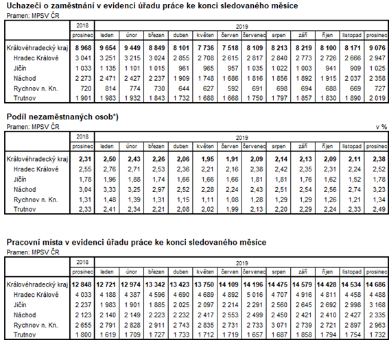 Úřady práce Královéhradeckého kraje evidovaly na konci prosince celkem 9 076 uchazečů o zaměstnání, tj. o 905 osob (relativně vyjádřeno o 11,1 %) více než v listopadu. Nárůst počtu uchazečů o zaměstnání zaznamenaly ve srovnání s měsícem předchozím všechny okresy. Nejvyšší nárůst byl v okrese Náchod, a Jičín (o 15,8 %, resp. 12,8 %), naopak nejnižší v okrese Trutnov (6,8 %).