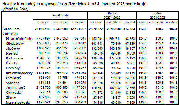V samotném 4. čtvrtletí 2023 se v Královéhradeckém kraji ubytovalo celkem 253,4 tisíc hostů, z toho 203,0 tisíc tvořili rezidenti, nerezidentů se ubytovalo 50,4 tisíc. V porovnání se stejným obdobím roku 2022 to bylo o 2,1 % méně. Pokles byl způsoben úbytkem domácích hostů, kterých se ve 4. čtvrtletí ubytovalo o 3,6 % méně. Naopak u zahraničních hostů došlo k nárůstu o 4,5 %.