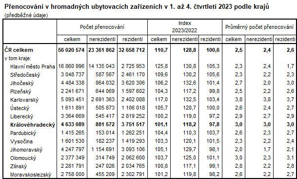 V samotném 4. čtvrtletí dosáhl počet přenocování v Královéhradeckém kraji 682,4 tisíc. V porovnání se stejným obdobím roku 2022 to bylo o 2,8 % méně. Tento pokles byl ovlivněn především snížením počtu přenocování u domácí klientely (o 4,5 %), počet přenocování zahraničních hostů se naopak o 4,5 % zvýšil. V porovnání se 4. čtvrtletím 2022 byl zaznamenán nárůst počtu přenocování u osmi krajů, pokles v Královéhradeckém kraji byl druhý nejvyšší po Libereckém kraji (pokles o 9 %).