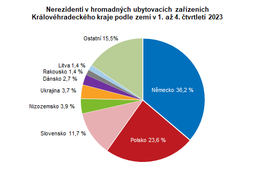 Nejvíce zahraničních hostů (podle státního občanství) přijelo do Královéhradeckého kraje tradičně z Německa, a to 107,6 tisíc. Jejich počet se zvýšil proti roku 2022 o více než jednu čtvrtinu. Druzí v pořadí byli opět hosté z Polska (70,0 tis. osob), jejichž počet se zvýšil o necelou čtvrtinu a třetí byli hosté ze Slovenska (34,7 tis. osob), kterých přijelo o 21,3 % více.