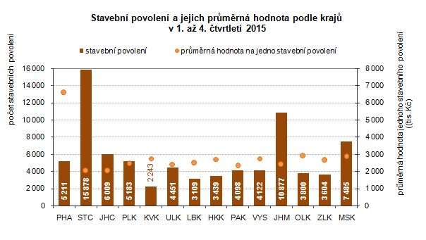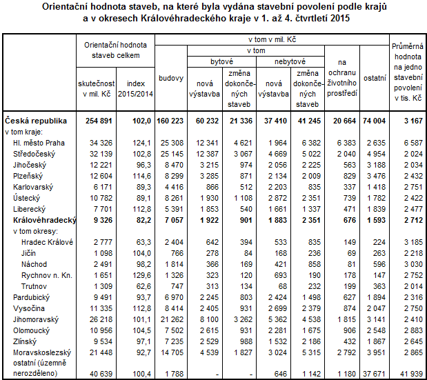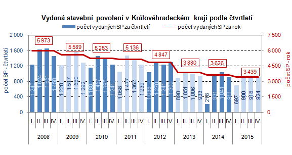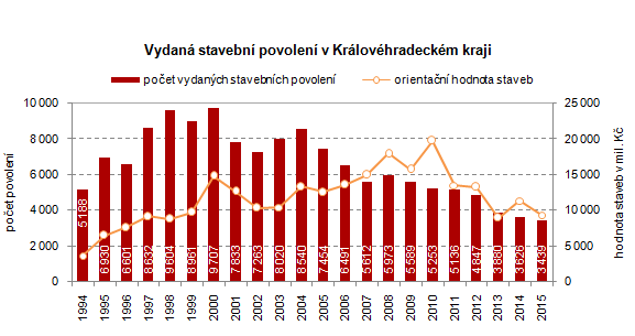 Za dvanáct měsíců roku 2015 vydaly stavební úřady Královéhradeckého kraje celkem 3 439 stavebních povolení (SP) v celkové orientační hodnotě 9 326 mil. Kč.