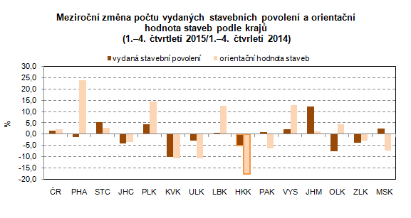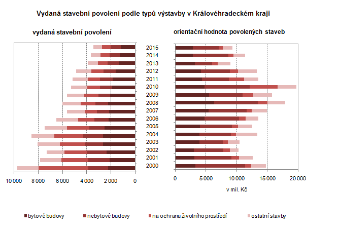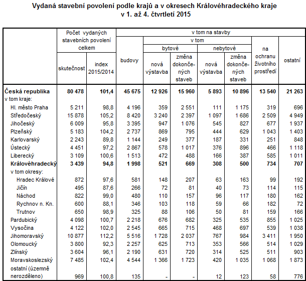 V celé České republice bylo v roce 2015 vydáno 80 478 stavebních povolení, to bylo o 1 121 SP (o 1,4 %) více než v roce 2014. Meziroční nárůst vykázala polovina z celkového počtu čtrnácti krajů. V Královéhradeckém kraji došlo k meziročnímu poklesu, tempo snížení bylo třetí nejrychlejší po kraji Karlovarském a Olomouckém.