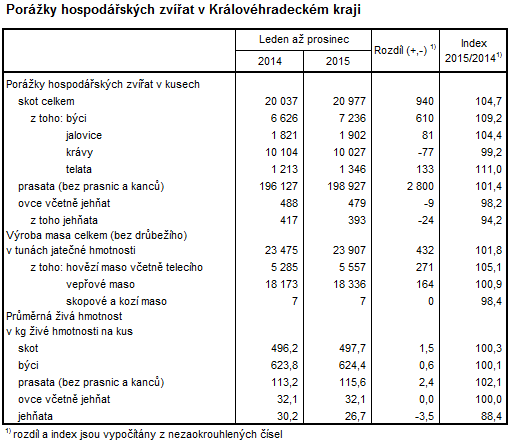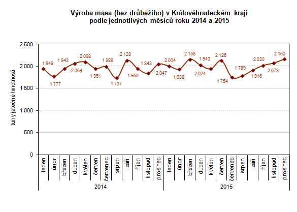 V Královéhradeckém kraji bylo od ledna do prosince 2015 vyrobeno 23,9 tis. tun masa v jatečné hmotnosti (bez masa drůbežího), tj. o 1,8 % meziročně více. Nejnižší objem výroby byl vykázán v červenci a v následujících měsících roku se objem produkce postupně zvyšoval. Naopak v České republice bylo v roce 2015 vyrobeno o 1,8 % masa méně než v roce 2014. Na celorepublikové produkci masa se kraj podílel 8,1 %, v roce předchozím to bylo 7,8 %.