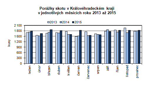 V období od ledna do prosince 2015 bylo v Královéhradeckém kraji poraženo celkem 20 977 kusů skotu, tzn. meziroční zvýšení o 4,7 % (tj. o 940 kusů). Nárůst zaznamenala většina kategorií skotu kromě krav. Mezi poraženými kusy převažovaly z 47,8 % právě krávy, kterých bylo poraženo o 0,8 % méně. Telat pak bylo poraženo o 11 % více, býků o 9,2 % a jalovic o 4,4 % více. V České republice bylo v roce 2015 poraženo 231 196 kusů skotu, meziročně o 3,7 % více. Na celkovém počtu poraženého skotu v České republice se Královéhradecký kraj podílel 9,1 %, nejvyšší podíl připadl na kraj Pardubický a Vysočina (22,2 %, resp. 21,5 %). Nárůst poraženého skotu zaznamenalo jedenáct krajů, jen u tří krajů (Jihomoravský, Pardubický a Jihočeský) došlo k poklesu.