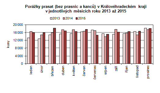 Prasat (bez prasnic a kanců) bylo v Královéhradeckém kraji poraženo v uplynulém roce téměř 199 tis. kusů, meziročně to bylo o 2 800 kusů, tj. o 1,4 % více. Počty poražených prasat v celé České republice se naopak meziročně snížily o 5,2 %, tj. o 133,5 tis. kusů. Ke zvýšení počtu poražených prasat došlo u pěti krajů, ostatní kraje zaznamenaly pokles. V Královéhradeckém kraji byl nárůst čtvrtý nejvyšší za krajem Libereckým, Zlínským a Plzeňským. K největšímu propadu došlo v Moravskoslezském kraji, kde bylo prasat poraženo o 26,4 % méně.