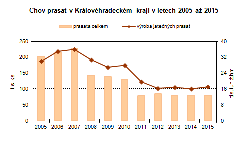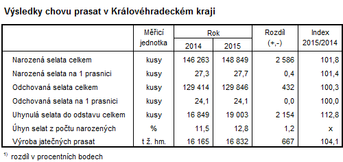 Podle výsledků výběrového šetření o chovu prasat k 31. prosinci 2015 bylo v Královéhradeckém kraji chováno celkem 80 tis. kusů prasat. Proti stejnému období roku 2014 jejich počet stoupl o 576 kusů (tj. o 0,7 %), což ovlivnil růst stavů mladých prasat o 2,1 tis. kusů (tj. o 11,7 %). Na celkových stavech prasat České republiky (1,6 mil. kusů) se kraj podílel 5,2 %. Z regionálního pohledu byl největší nárůst zaznamenán v kraji Ústeckém (o 15,9 tis. kusů, tj. o 18,4 %), největší meziroční pokles vykázal Moravskoslezský kraj (o 20,1 tis. kusů, tj. o 34,7 %). Počty prasnic meziročně stagnovaly. Proti stavu k 31. 7. 2015 stavy prasat klesly o 4,3 %, z toho stavy prasnic klesly o 1,3 %.