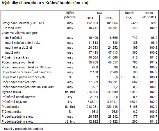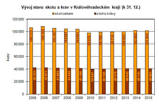 Na základě výsledků výběrového šetření bylo v Královéhradeckém kraji k 31. prosinci 2015 zjištěno celkem 101,7 tis. kusů skotu, což je meziročně o 429 kusů méně (tj. o 0,4 %). Ve struktuře podle věku převažoval ze 46,6 % skot starší dvou let.