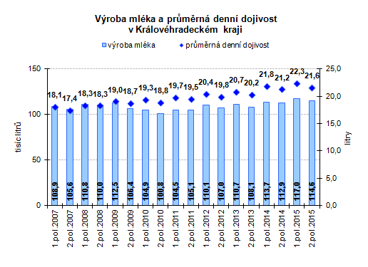 V roce 2015 bylo vyrobeno téměř 232 mil. litrů mléka, tj. o 2,2 % více než byla skutečnost v roce 2014. Průměrná denní dojivost ve výši 22,0 litrů vzrostla o 2,0 %. Mléka se prodalo více jak 223 mil. litrů. Tržnost mléka představovala 96,5 % a meziročně se o 0,2 p.b. zvýšila.