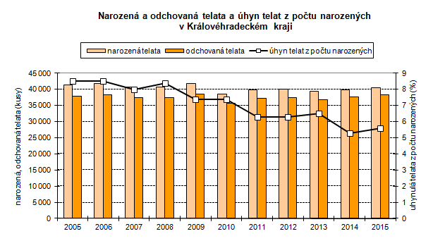 Počet narozených telat v kraji meziročně stoupl o 768 kusů, tj. o 1,9 %, počet odchovaných telat o 602 kusů, tj. o 1,6 %. Na 100 krav připadá 99,0 narozených telat. Úhyn telat z počtu narozených dosahoval 5,6 %, což je méně než průměr ČR (6,0 %). Na 100 krav tak bylo odchováno 93,2 telat.