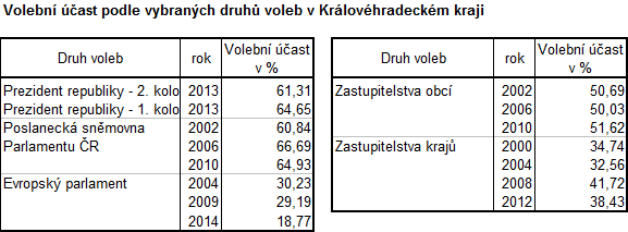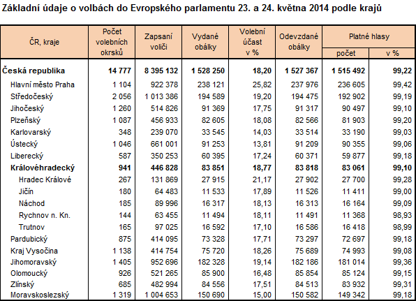 | Voleb do Evropského parlamentu se v Královéhradeckém kraji zúčastnilo 84 tisíc voličů. Volební účast 18,77 % byla čtvrtá nejvyšší mezi kraji, v roce 2009 se těchto voleb v kraji zúčastnilo 29,19 % a v roce 2004 to bylo 30,23 %. V Královéhradeckém kraji přišlo ve dnech 23. a 24. 5. 2014 k třetím volbám do Evropského parlamentu celkem 83 851 voličů, což představuje 18,77 % a čtvrtou nejvyšší účast mezi kraji. Oproti průměru za Českou republiku, kde volební účast představovala 18,20 %, to bylo o 0,57 procentního bodu více. Kraj se tak umístil za Hl. městem Praha, Středočeským a Jihomoravským krajem.