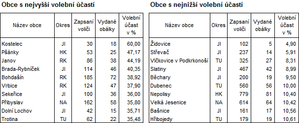 Mezi okresy kraje byla nejvyšší volební účast v okrese Hradec Králové s 21,17 % a ve zbývajících okresech byla volební účast pod průměrem kraje. Volebního práva nejméně využili voliči z okresu Trutnov. Nejvyšší volební účast byla v kraji v obci Kostelec v okrese Jičín (60,00 %) a nejnižší v obci Židovice v okrese Jičín (4,90 %). V Královéhradeckém kraji se volilo ve všech 448 obcích a nejvyšší účast se pohybovala u prvních deseti obcí od 60,00 % po 35,48 % a naopak nejnižší u posledních deseti obcí od 4,90 % po 10,61 %.
