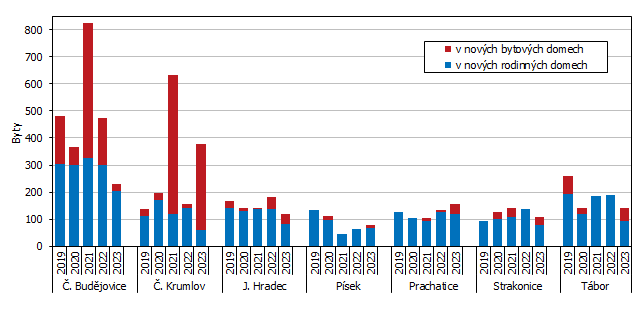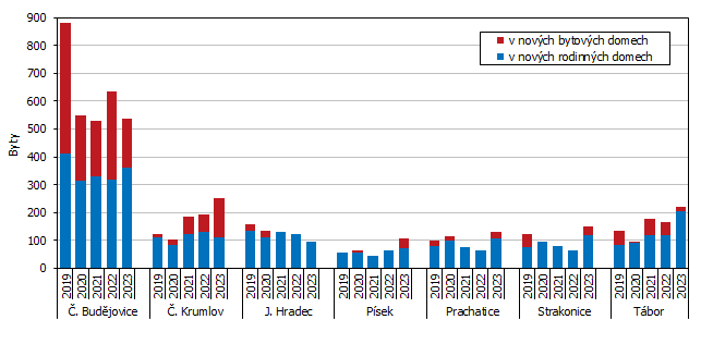 Byty v nových bytových domech byly v prvních třech čtvrtletích roku 2023 dokončeny v šesti okresech, nejvíce jich bylo zkolaudováno na Českobudějovicku (173 bytů). Naopak v okrese Jindřichův Hradec nebyl zkolaudován ani jeden byt tohoto typu.