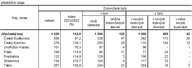 V lednu až září roku 2023 byla v Jihočeském kraji podle předběžných údajů zahájena výstavba 1 547 bytů, což bylo o necelá 4 % méně než ve stejném období předchozího roku. Naopak u dokončených bytů byl patrný meziroční nárůst o 12,0 %. V kraji bylo zkolaudováno celkem 1 629 bytů.