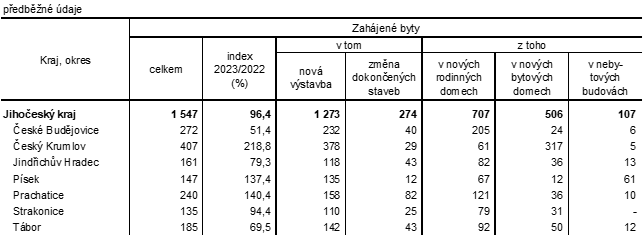 Ve třech okresech Jihočeského kraje byl v 1. až 3. čtvrtletí 2023 zaznamenán meziroční nárůst počtu zahájených bytů, nejvyšší na Českokrumlovsku (+118,8 %). Zde se z více než tří čtvrtin jednalo o výstavbu bytů v nových bytových domech. Ve zbylých čtyřech okresech byl zaznamenán meziroční pokles, přičemž na Českobudějovicku dosáhl počet zahájených bytů pouze polovičních hodnot oproti stejnému období roku 2022.