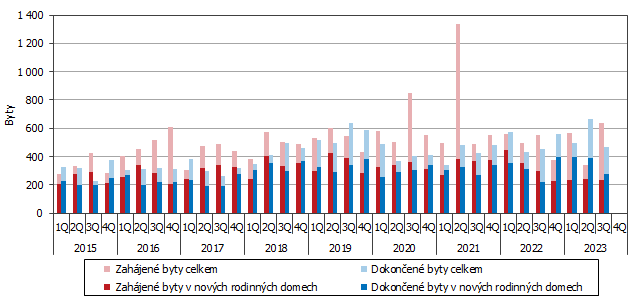 V České republice byla za tři čtvrtletí roku 2023 zahájena výstavba 27 304 bytů, což bylo zhruba o 15 % méně než ve stejném období předchozího roku. Počet zahájených bytů se snížil ve všech krajích s výjimkou Karlovarského (+5,5 %). Největší meziroční pokles byl zaznamenán v Olomouckém kraji, kde se objem zahájené výstavby snížil téměř o 40 %.
