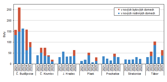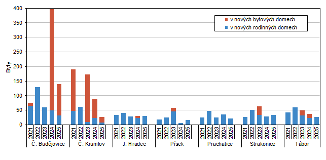 Byty v nových bytových domech byly v 1. čtvrtletí 2025 dokončeny v pěti okresech a jejich počet meziročně mírně klesl. Nejvíce těchto bytů bylo dokončeno na Jindřichohradecku, kde jich bylo zkolaudováno 26. V okresech Prachatice a Strakonice nebyl zkolaudován ani jeden byt tohoto typu.