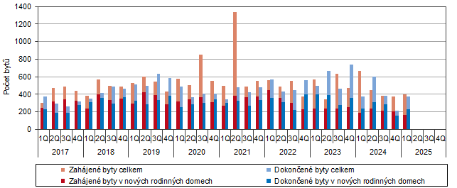 V Česku byla v 1. čtvrtletí 2025 zahájena výstavba 8 297 bytů, což bylo o 2,9 % více než ve stejném období roku 2024. Počet zahájených bytů se zvýšil v šesti krajích. Největší meziroční nárůst uvedl Karlovarský kraj, kde se zahájená výstavba zvýšila trojnásobně. K poklesu počtu zahájených bytů došlo v osmi krajích. Největší pokles, a to o dvě třetiny, vykázal kraj Plzeňský.