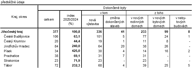 Jihočeský kraj v prvních třech měsících roku 2025 uvedl 377 dokončených bytů, což bylo prakticky stejně jako ve stejném období minulého roku. Podíl kraje na dokončené výstavbě v Česku činil 5,7 % a v mezikrajském srovnání se řadil na šesté místo.