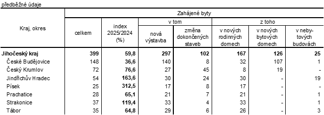V Jihočeském kraji byla v 1. čtvrtletí 2025 zahájena výstavba 399 bytů, přičemž meziroční propad dosáhl 40,2 % a v rámci Česka byl druhý největší. I tak se kraj na celorepublikovém počtu zahájených bytů podílel 4,8 %, což ho v mezikrajském srovnání řadilo na pátou příčku. V kraji počet zahájených bytů stagnuje, již třetí čtvrtletí po sobě byl jejich počet menší než 400.