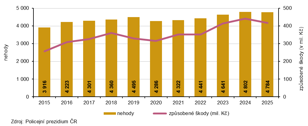 Hmotná škoda vzniklá při dopravních nehodách v Česku činila v roce 2025 celkem 8 346,9 mil. Kč a byla vyšší než v předchozím roce (+4,4 %). Nejvyšší hmotná škoda byla zaznamenána ve Středočeském kraji a Praze, naopak nejnižší v Karlovarském kraji. V Jihočeském kraji byly škody při dopravních nehodách vyčísleny na 418,3 mil. Kč a byly o 5,3 % nižší než v předchozím roce. Na jednu dopravní nehodu připadla v kraji v průměru škoda ve výši více než 87 tis. Kč. Nejvyšší hodnota hmotných škod byla zaznamenána v okrese České Budějovice (133,2 mil. Kč), naopak nejnižší v okrese Prachatice (30,2 mil. Kč). V Jihočeském kraji vzrostla výše věcných škod v okresech Český Krumlov, Strakonice a Tábor, v ostatních okresech byla meziročně nižší.