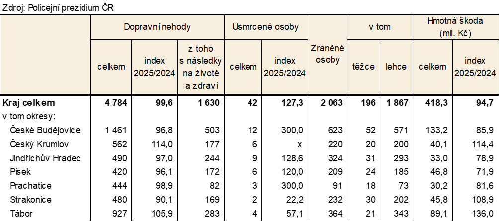 Na jihočeských silnicích došlo v roce 2025 celkem k 4 784 dopravním nehodám, při nichž bylo usmrceno 42 osob, těžce zraněných bylo 196 osob. Lehce se při dopravních nehodách zranilo 1 867 osob. Celková hmotná škoda byla vyčíslena na 418,3 mil. Kč.