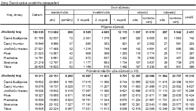 Nejvíce příjemců všech důchodů žilo v okrese České Budějovice, nejméně jich bylo zaznamenáno na Prachaticku. Podíl příjemců všech starobních důchodů bez souběhu činil v kraji 63,3 %, přičemž nejvyšší byl na Táborsku (65,2 %) a nejnižší v okrese Prachatice (58,7 %).