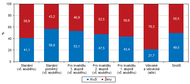 Většina z příjemců důchodů (83,4 %) pobírala starobní důchod, ať už samostatně nebo v souběhu s vdovským případně vdoveckým důchodem. Téměř ve všech kategoriích příjemců převažovaly ženy, výjimku tvořily pouze důchody starobní poměrný včetně souběhu a pro invaliditu 3. stupně, kde mírně převažovali příjemci-muži. Výrazná převaha žen byla zjištěna u pozůstalostních důchodů vyplácených samostatně, když na 1 vdovce připadaly téměř 4 vdovy.