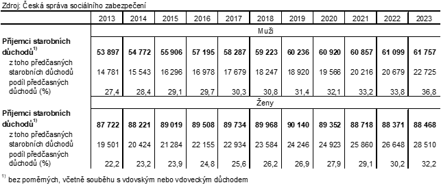 V prosinci 2023 pobíralo v Jihočeském kraji předčasný starobní důchod (bez poměrného, včetně souběhu s pozůstalostním důchodem) 34,1 % starobních důchodců. Proti roku 2013 vzrostl počet osob, které do důchodu odešly předčasně, téměř o polovinu.