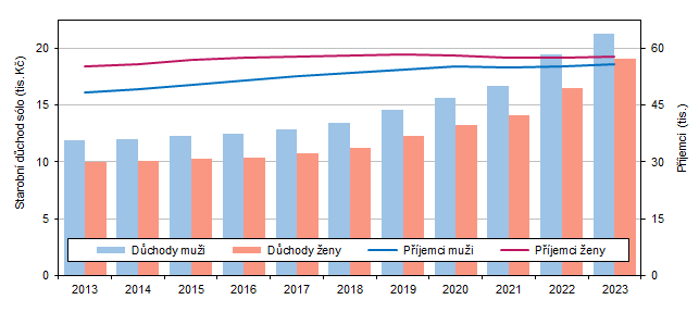 Díky tomu se rozdíl mezi počtem důchodců a důchodkyň výrazně snížil. Zatímco v roce 2013 počet žen pobírajících starobní důchod sólo převyšoval počet mužů o 7 037, v roce 2023 rozdíl klesl ke čtvrtině a činil již jen 1,9 tis. osob.