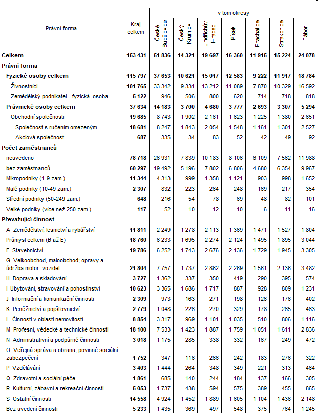 Necelá polovina ekonomických subjektů v kraji (48,7 %) vykázala v kategorii počtu zaměstnanců svou velikost; převážná většina z nich uvedla stav bez zaměstnanců (80,7 %). Mezi subjekty se zaměstnanci převládaly tzv. mikropodniky (1–9 zaměstnanců). V kraji zaměstnávalo 250 a více zaměstnanců celkem 117 podniků, přičemž 52 z nich se nacházelo v okrese České Budějovice.