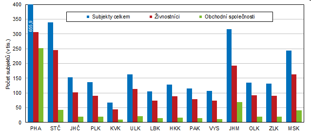 Ke snížení počtu ekonomických subjektů došlo ve všech krajích ČR; nejprudší pokles byl evidován ve Zlínském (−9,8 %) a Královéhradeckém (−9,5 %) kraji. Naproti tomu nejmenší meziroční snížení (−2,2 %) zaznamenala Praha. V hlavním městě Praze sídlilo 23,4 % ekonomických subjektů (655 855) ze všech v RES evidovaných jednotek a jejich podíl byl v mezikrajském srovnání výrazně nejvyšší. Jako druhý se v pomyslném žebříčku krajů umístil Středočeský kraj se svým 12,1% podílem, následován Jihomoravským krajem (11,3 %). Právnické a fyzické osoby na jihu Čech tvořily 5,5 % ze všech subjektů sídlících v ČR.