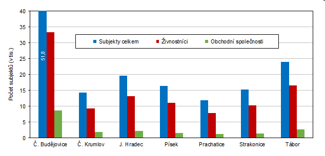 Jednoznačně nejvíce podnikatelských subjektů se v meziokresním srovnání v rámci Jihočeského kraje nacházelo v okrese České Budějovice, a to 51 836. Subjekty v tomto okrese tvořily 33,8% podíl ze všech subjektů v kraji. Všechny okresy jižních Čech vykázaly úbytek ekonomických subjektů oproti konci roku 2022.