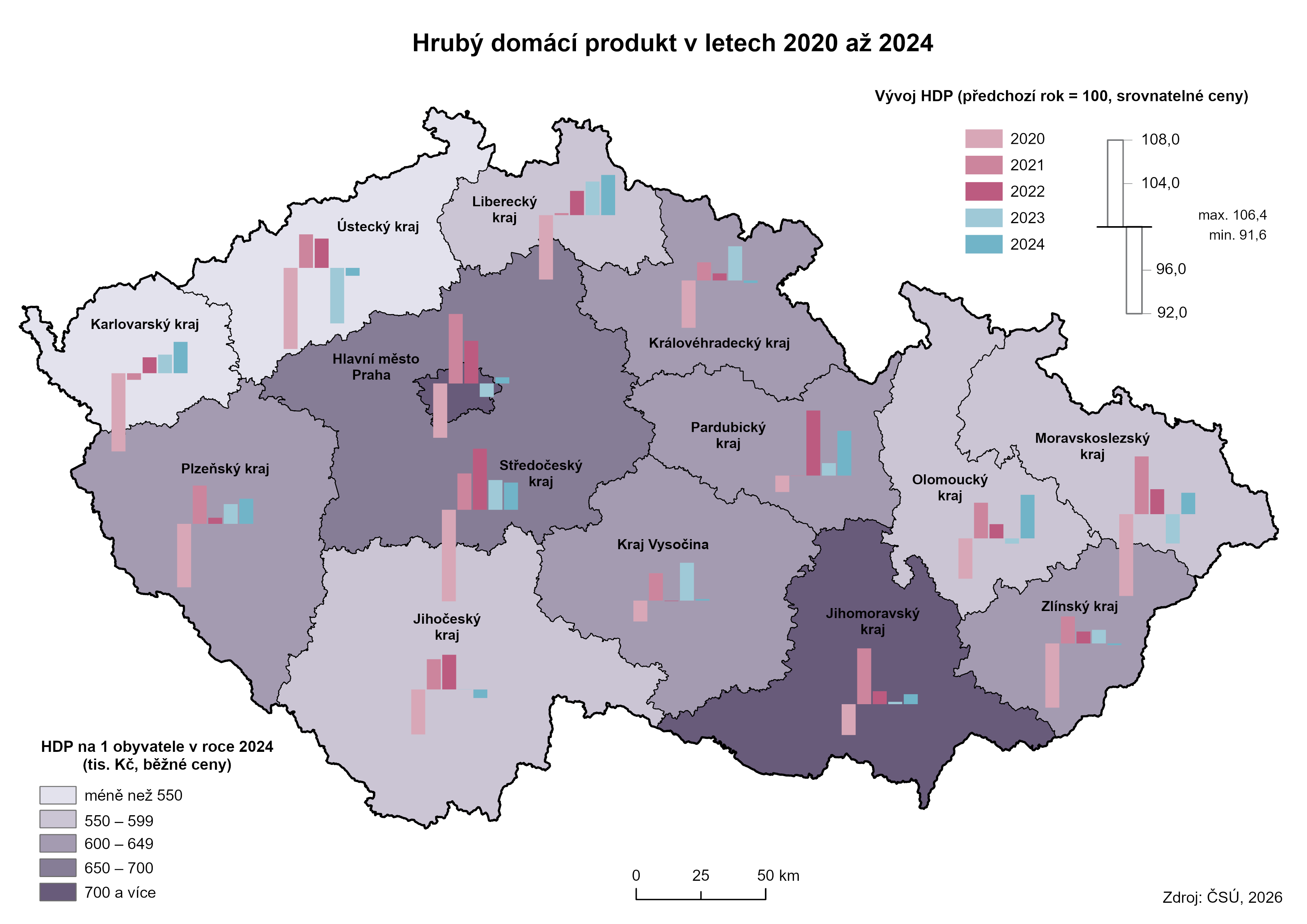Poznámka: Český statistický úřad zveřejnil začátkem roku 2026 regionální makroekonomické ukazatele za rok 2024, které jsou předběžné, spolu s údaji za rok 2023, které jsou definitivní.