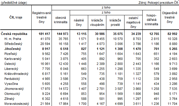V Jihočeském kraji byl v roce 2023 zaznamenán téměř stejný počet trestných činů jako v roce 2022. Kriminalita tedy v kraji nevzrostla a mezi kraji zde byl 7. nejnižší počet registrovaných trestných činů. Celkem 45,7 % trestných činů se v roce 2023 v ČR podařilo objasnit, což je o jeden procentní bod více oproti minulému období.
