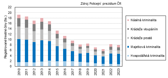 V rámci ČR se kriminalita meziročně mírně snížila. Menší počty registrovaných trestných činů byly zaznamenány v šesti krajích. Největší pokles byl v Libereckém kraji (−8,3 %). Největší nárůst naopak zaznamenal Kraj Vysočina, ve kterém se počet registrovaných trestných činů zvýšil o 7,0 %. Početně nejméně registrovaných trestných činů bylo evidováno v Pardubickém kraji (4 985), naopak nejvíce v hlavním městě Praze (41 070).