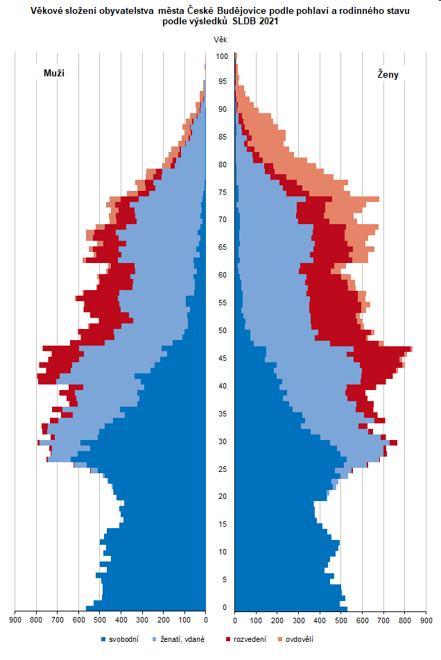 Graf 4-4. Věkové složení obyvatelstva podle pohlaví a rodinného stavu (podle SLDB)